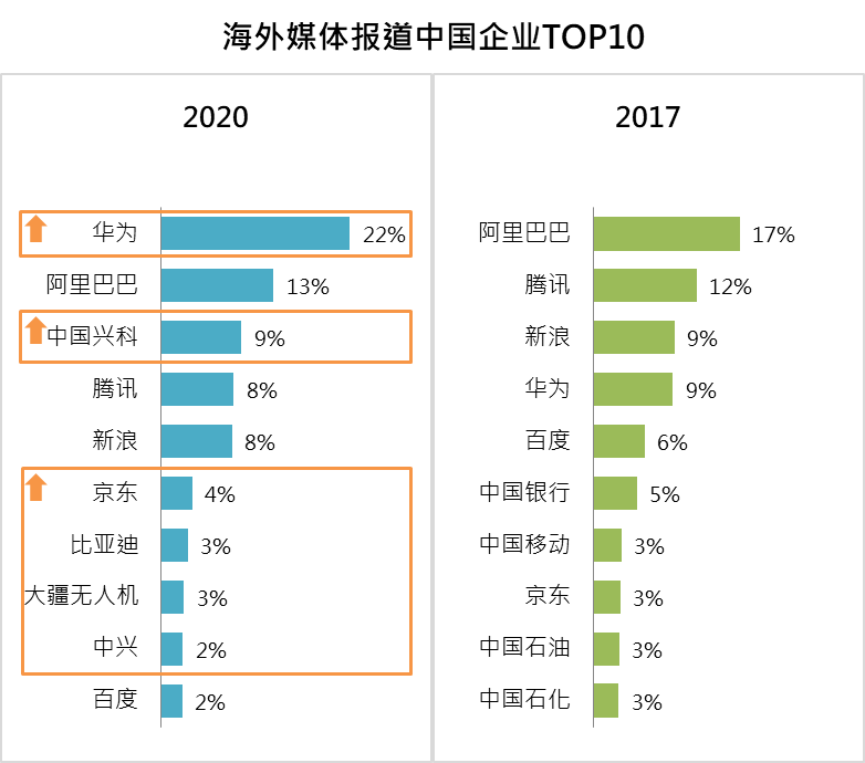 通过分析海外新闻媒体的报道,我们发现,2020年海外媒体对中国企业的关注对象,在数据层面上确实与3年前有所不同。2017年,世界经济相对处于低迷期,而中国企业阿里巴巴的电商业务风生水起,腾讯亦以其微信产品吸引世界目光。但在过去几年中,华为作为中国领先的科技公司,因在贸易战中受到美政府打压,反而在世界舞台上备受瞩目。另一方面在疫情的大背景下,中国科兴亦因研制新冠疫苗而受到关注。值得注意的是,比亚迪作为中国汽车制造商,在2020年以前,世界知名度或许一般,但因其疫情转型生产口罩并出售海外,而获得不少海外媒体报道。